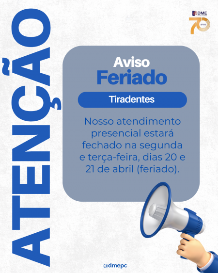 Nos dias 20 e 21 de abril (segunda e terça-feira), o atendimento presencial estará fechado.
