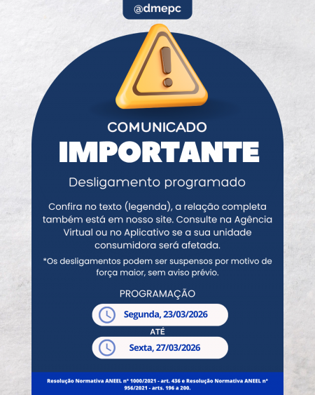 Acesse: Atendimento >> Agência Virtual >> Desligamentos Programados ou https://www2.dmepc.com.br/AgenciaVirtual/ServicosComplementares/DesligamentosProgramados