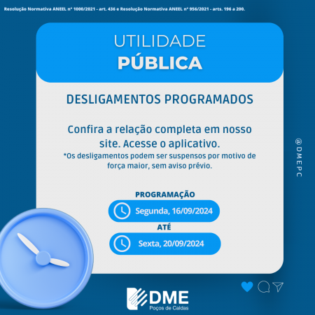 Lembrando que as equipes de manutenção da DME estarão sempre uniformizadas, utilizando equipamentos de segurança e em veículos devidamente identificados e sinalizados.